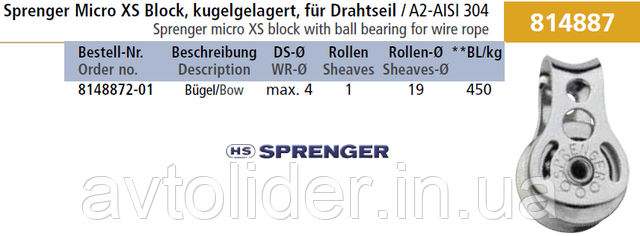SPRENGER — мікро XS-блок із кулькопідшипником, для метилічного троса до 4 мм