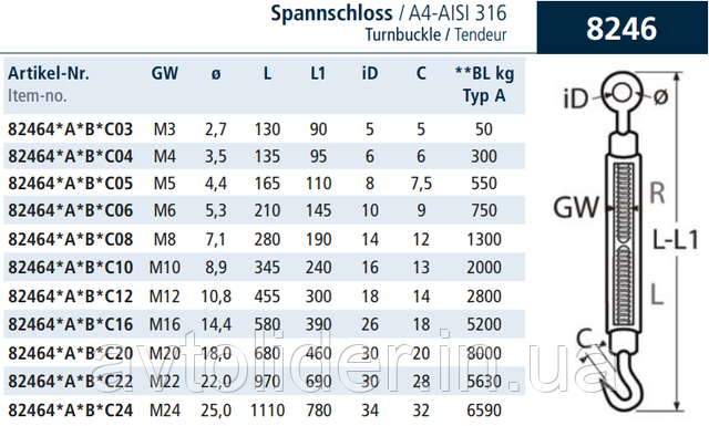 талреп гак-кільце з відкритою муфтою виготовлений з нержавіючої сталі А4 (AISI 316).
