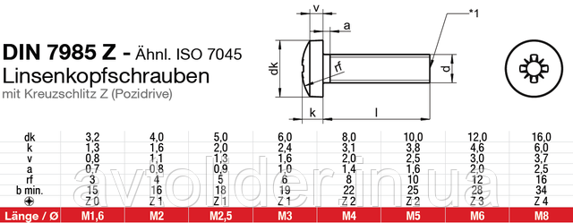 DIN 7985, шліц Pz (Pozidrive) :