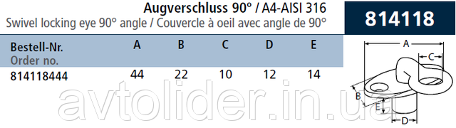 Вертлюжний обух із фіксатором, з нахилом 90 градусів, нержавіюча сталь А4 (AISI 316)