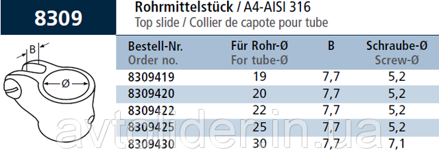 кронштейн із неіржавкої сталі А4 (AISI 316) встановлюється на трубу, діаметром 19, 20, 22, 25 або 30 мм і кріпиться за допомогою притискного гвинта.