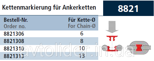 вшивка-маркер призначена для ланцюга, діаметром 6, 8, 10 і 13 мм.